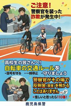 県内において、この制度を悪用した詐欺被害が発生し、自転車で走行中の高校生が、車に乗った男から違反を指摘され、現金を騙し取られました。